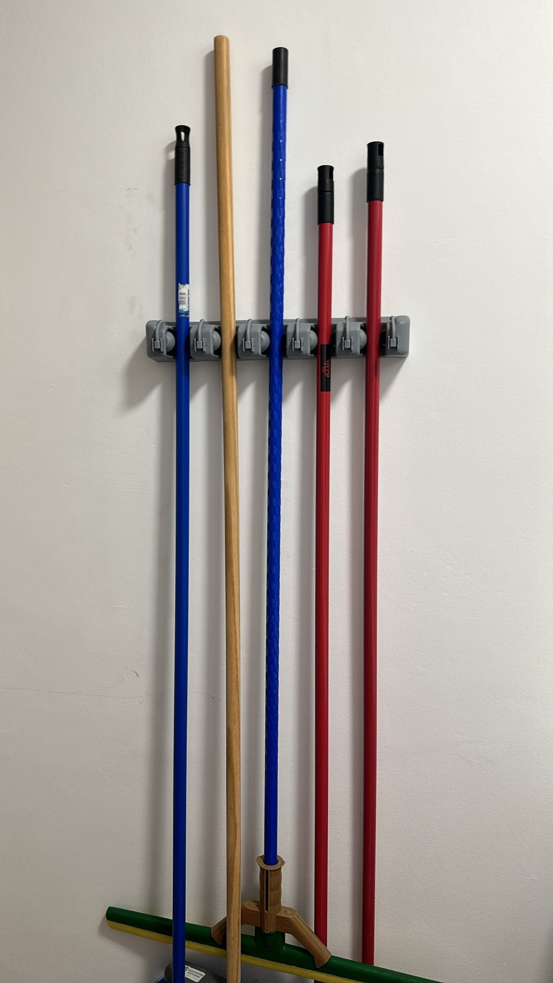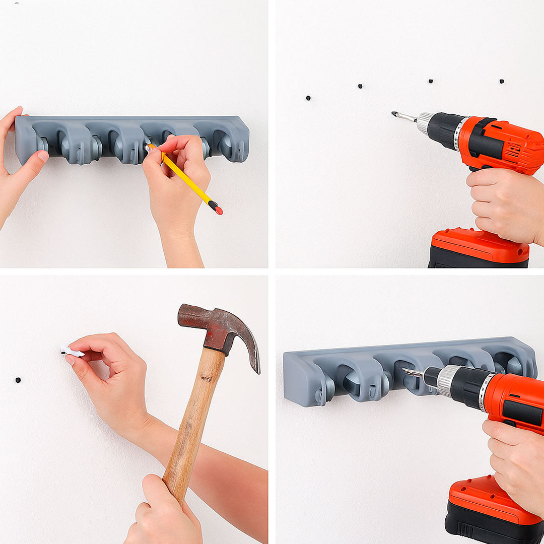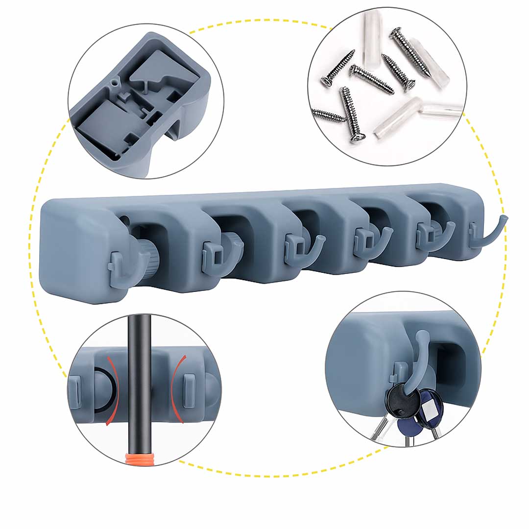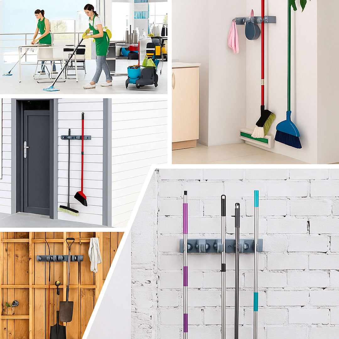 ordene sus rastrillos, herramientas, escobas y trapeadores. Perfecto para la cocina, el armario, el garaje, la oficina, ideal para uso comercial y, gracias al diseño resistente a la intemperie, este soporte funciona incluso al aire libre.