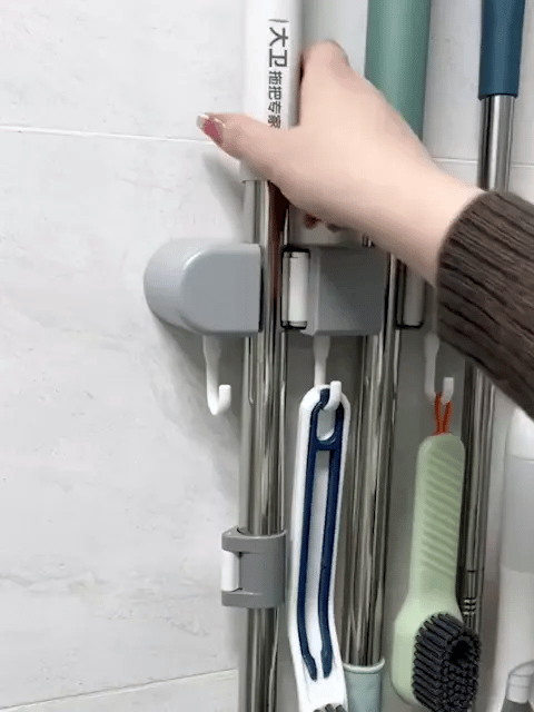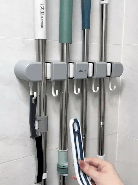 Este soporte de pared para trapeador y escoba es ideal para ahorrar espacio. El estante para trapeador tiene 5 posiciones y 6 ganchos para ayudar a colgar el trapeador y la toalla. Haz que tu Despensa esté limpia y organizada