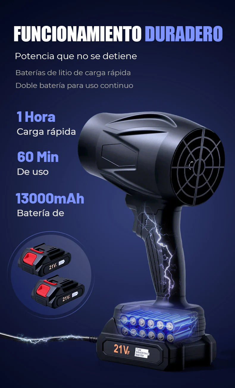 Cada batería tiene una autonomía de hasta 60 minutos con uso continuo, dependiendo de la velocidad utilizada. El tiempo de recarga es de aproximadamente 90 minutos por batería gracias al cargador rápido incluido.